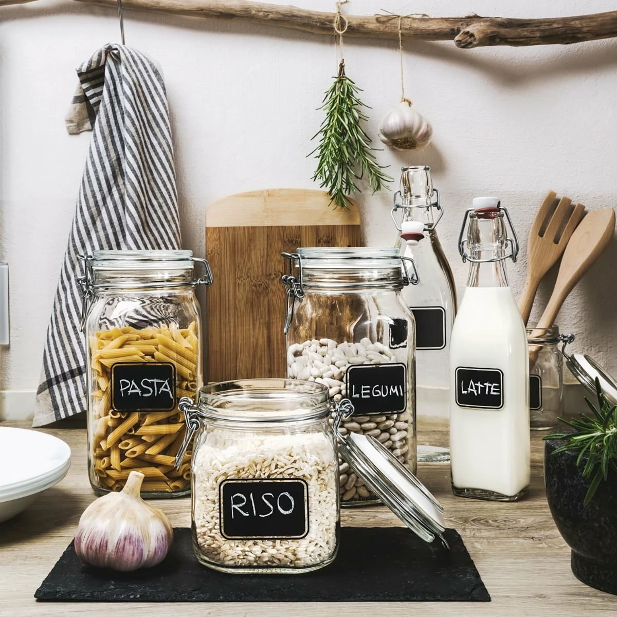 With an airtight hinged lid, the Bormioli Rocco Swing Bottle with Chalkboard Labels is suitable for storing just about anything. This swing bottle features a chalkboard area so you can quickly label contents and then easily change it as you like. Proudly use the glass swing bottle as a counter top canister to display your dry baking and cooking supplies.