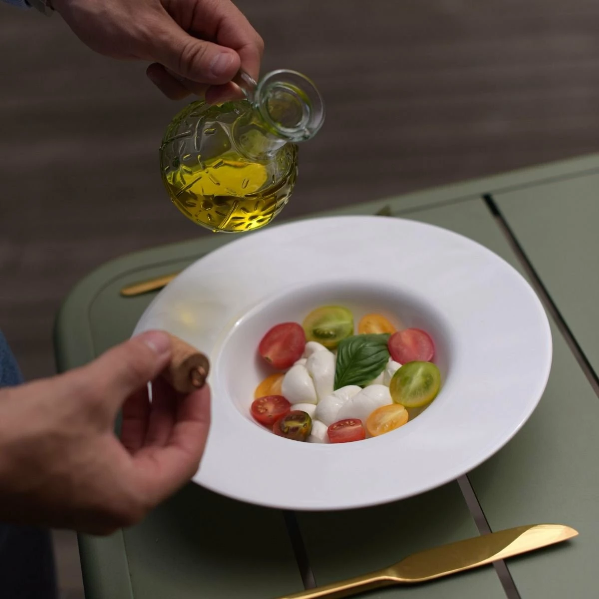 This 7 oz oil cruet from Bormioli Rocco is not only the perfect size for serving olive oil and vinegar for 2 at your dinner table, it also makes a beautiful decorative piece for your home. With its green tinted glass and its elegant star burst design the Bormioli Rocco Olivia oil and vinegar bottle will add a touch of elegance to any space. The 4.5″ oil cruet is made in Italy.