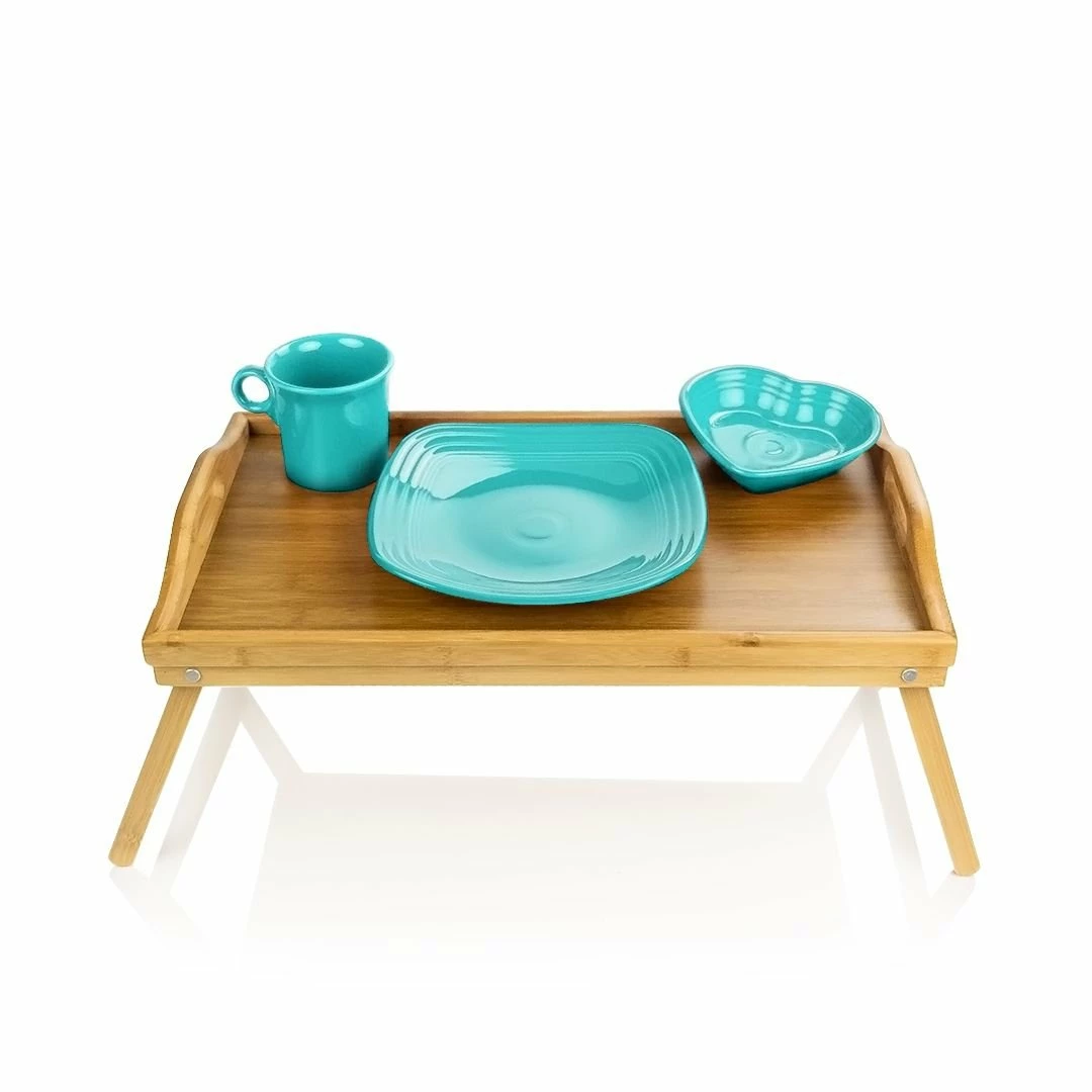 The Everything Kitchens Exclusive “Breakfast in Bed” set includes a large bamboo serving tray with fold-out legs for stability and sturdy handles for safe carrying. No worries if you drip pancake syrup or strawberry jam on the tray, simply wipe clean with a damp cloth. Make an equally impressive statement with the vibrant Turquoise Fiesta® Heart Bowl, Square Plate & Coffee Mug in the set. All of the dinnerware pieces are dishwasher safe, oven safe & microwave safe.
