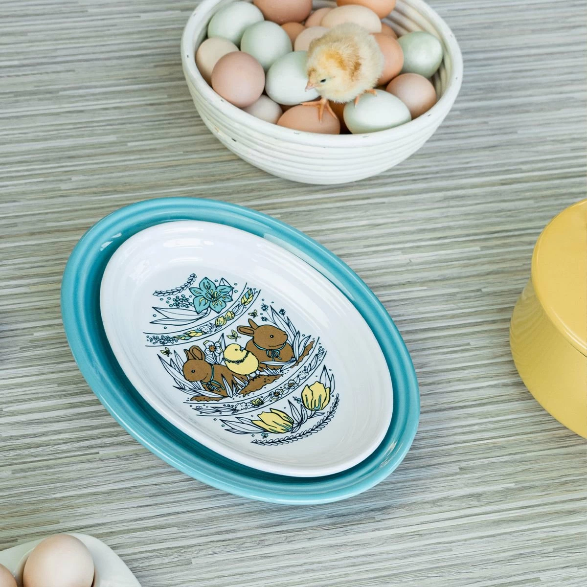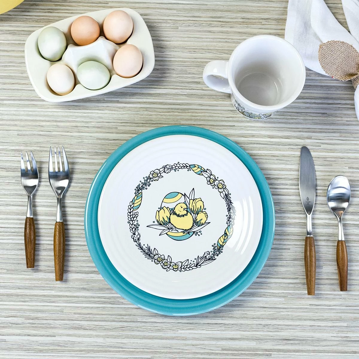 Spring is in the air – hear the birds chirping & breathe in the sweet aroma of blossoming flowers. The Everything Kitchens’ Exclusive Easter Enchantment collection by Fiesta® features curious baby chicks & fuzzy bunnies searching for hidden Easter eggs in fields of fresh flowers. This design is an Everything Kitchens exclusive so you can’t get it anywhere else. This detailed design pops with Turquoise & Sunflower accents which serve to help coordinate this piece with others in the Easter Enchantment collection, as well as existing Fiesta® dinnerware. The pieces in this collection are made of Homer Laughlin’s fully vitrified china, made in the USA. This durable construction is further backed by a 5-Year no-chip warranty so you can serve your friends and family confidence. Expand your Fiesta® collection today and take home an exclusive piece.