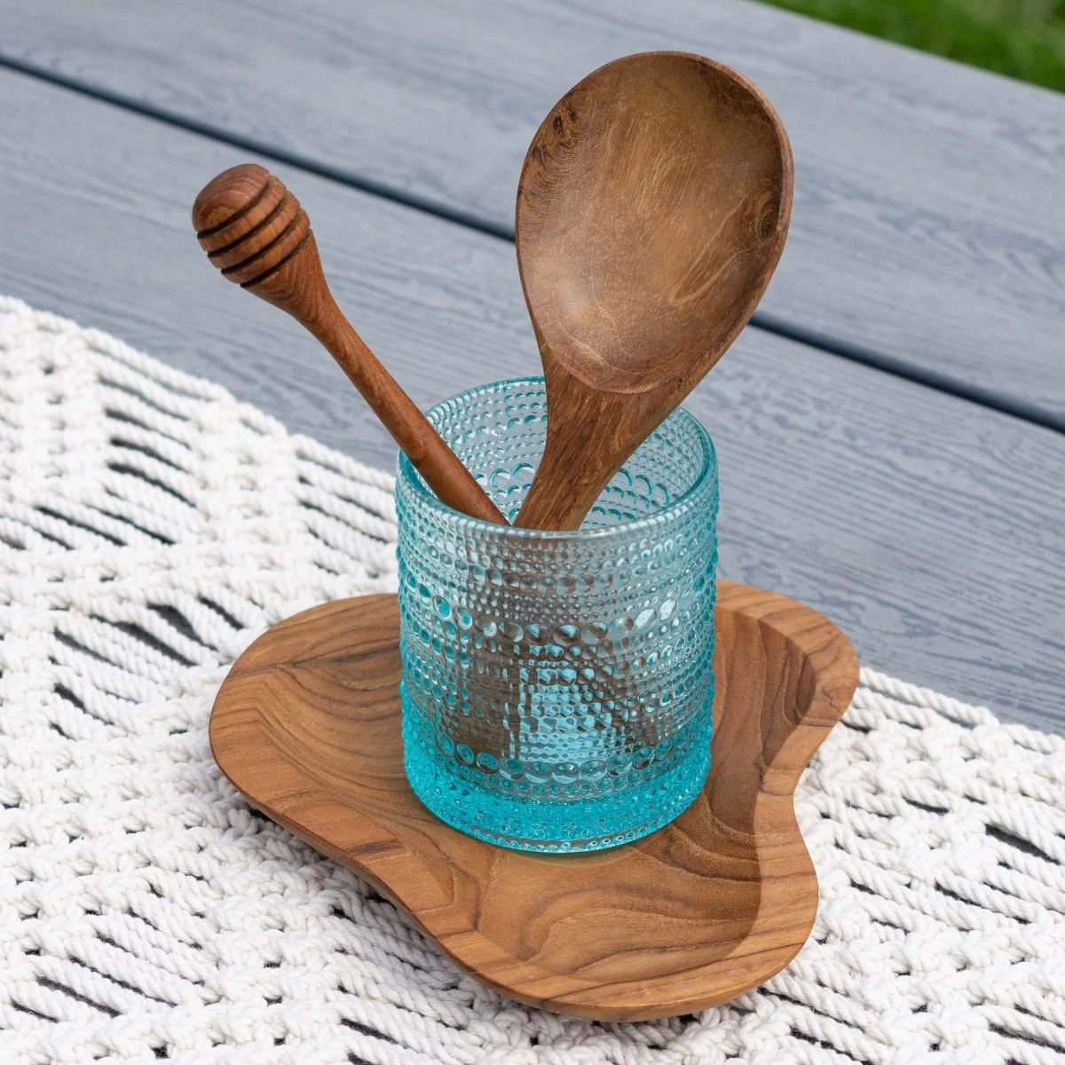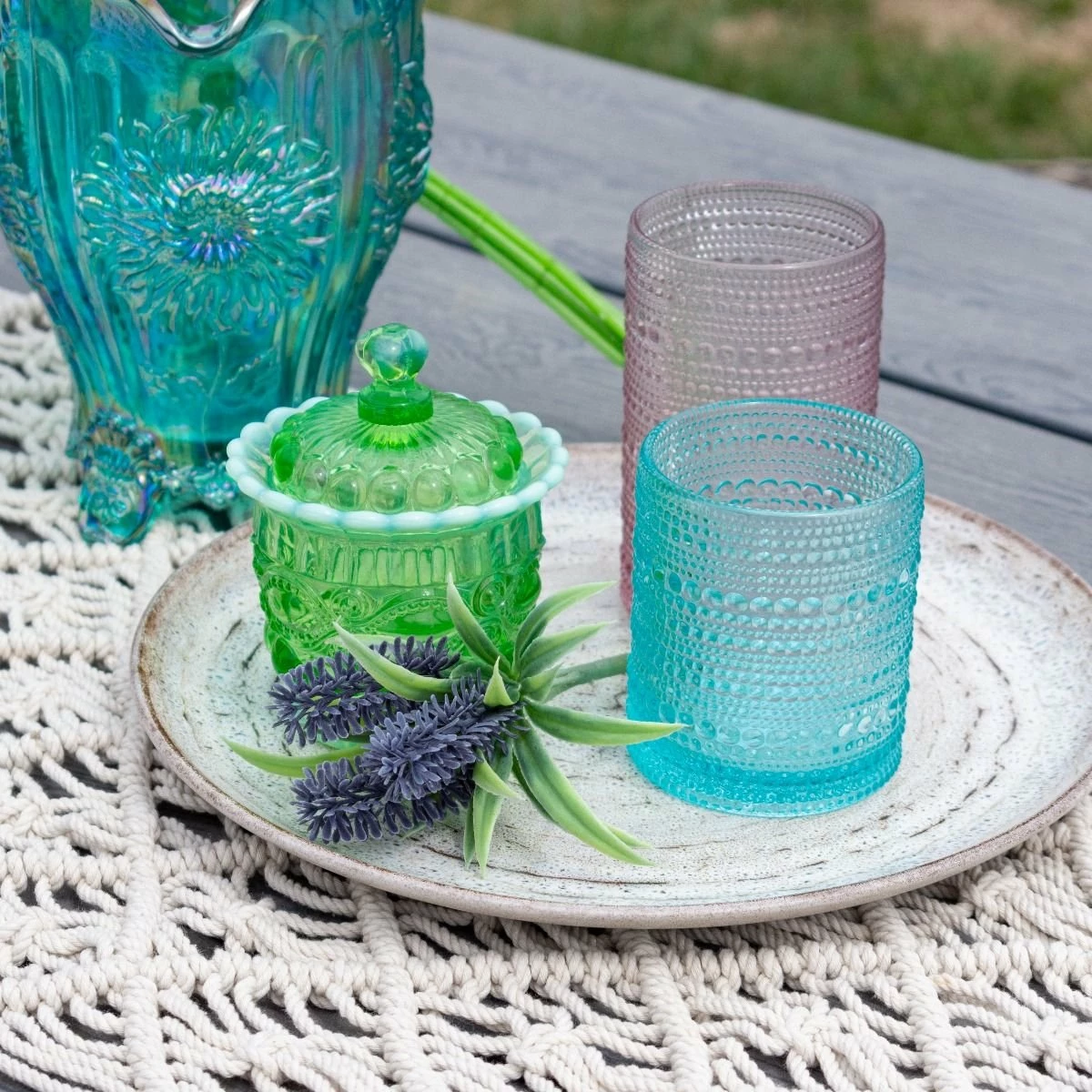 Add an eye-catching texture to your table setting with the Jupiter Double Old Fashioned Glass in stylish Pool Blue. Inspired by vintage glassware found in Parisian flea markets, the Jupiter Collection features an intricate beaded detailing around the glass for a unique presentation of any beverage. This vintage-style piece is made of durable, high-quality glass and has a sturdy, weighted base for a quality piece of drinkware perfect for evening summer dinner parties and everyday dining. Whether you’re serving up soft drinks around the dinner table or mixing cocktails for your home bar, this glassware from Fortessa adds another level of style. For a subtle touch of color that’ll give your table a vintage, French-style charm, try the Jupiter Collection by Fortessa today!