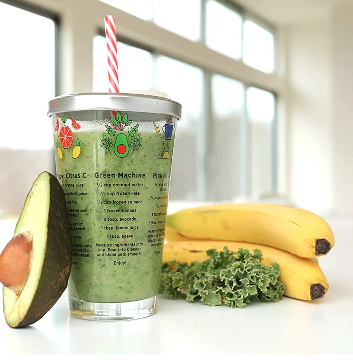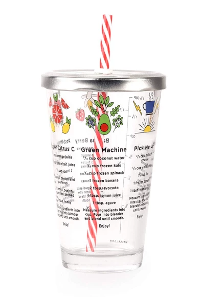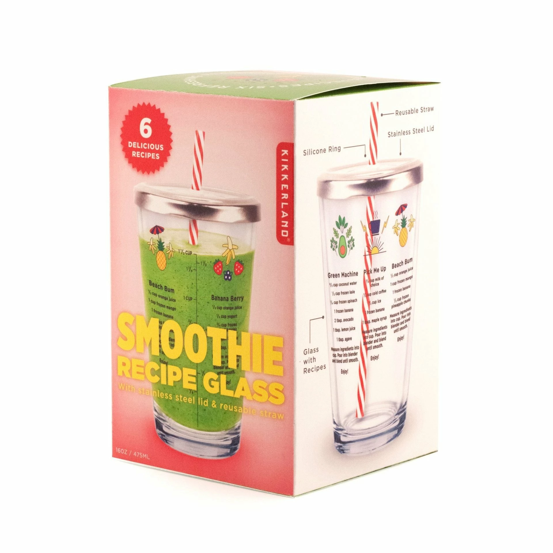 Jump-start your morning with an energizing and refreshing smoothie served in the Smoothie Recipe Glass by Kikkerland! Made of glass and stainless steel, this smoothie glass features 6 smoothie recipes so you can make a different delicious smoothie Monday through Friday! The Smoothie Recipe Glass includes a stainless steel lid and a fun red and white reusable straw, so you can take your beverage on the go. For an invigorating breakfast or afternoon pick-me-up, try the Smoothie Recipe Glass by Kikkerland today!