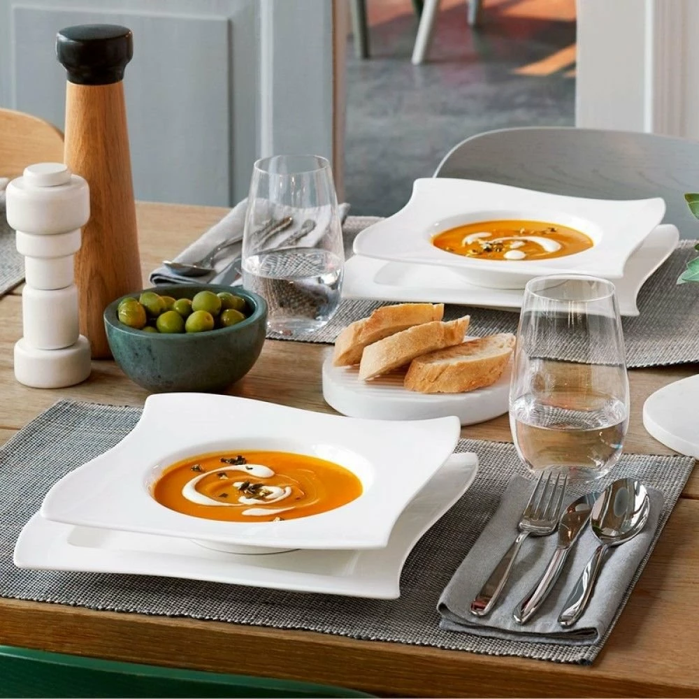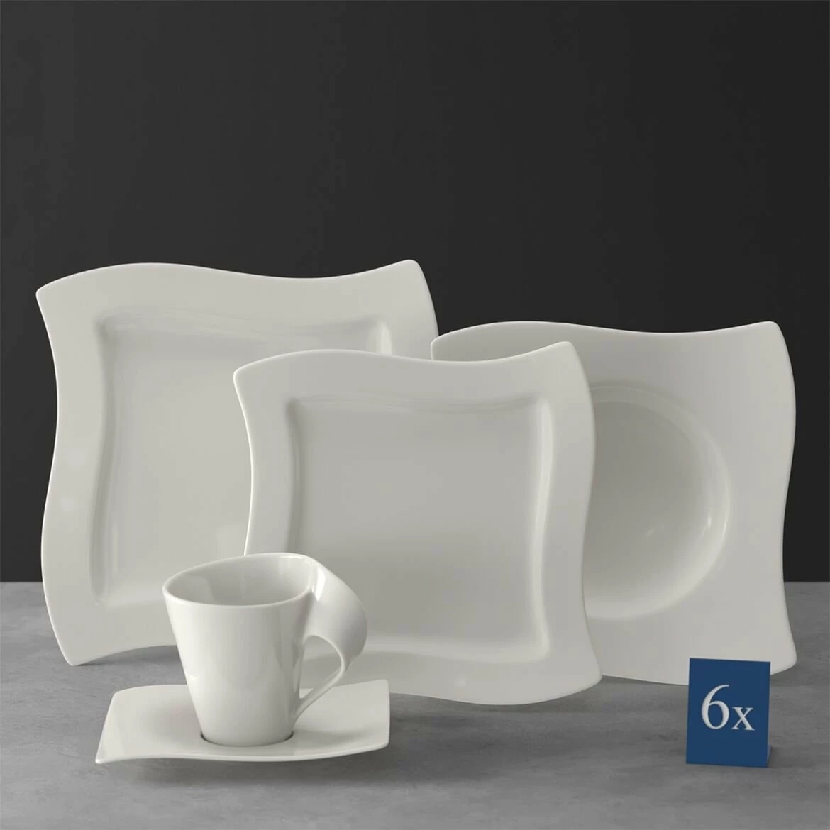 Make stylish waves in your dining room by serving guests with the Villeroy & Boch NewWave 30-Piece Dinnerware Set! This dinnerware set is made from Villeroy & Boch’s premium porcelain, which resists chipping, cracking, and crazing. The waved square shape of the plates and bowl make for a unique elevation to classic dinnerware, while the waved handles of the mugs make for sophisticated sipping. While durable enough for everyday use, each piece of the NewWave Collection stands on its own as a modern art piece – allowing for a sleek meal presentation every day of the week.